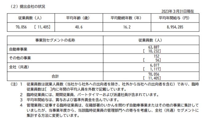 トヨタ自動車(提出会社)の2023年3月末時点での従業員数、平均年齢、平均勤続年数および平均年間給与は以下の通りです。
