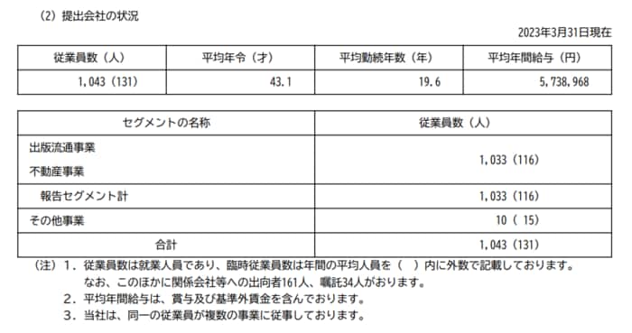 トーハン(提出会社)の2023年3月末時点での従業員数、平均年齢、平均勤続年数および平均年間給与は以下の通りです。