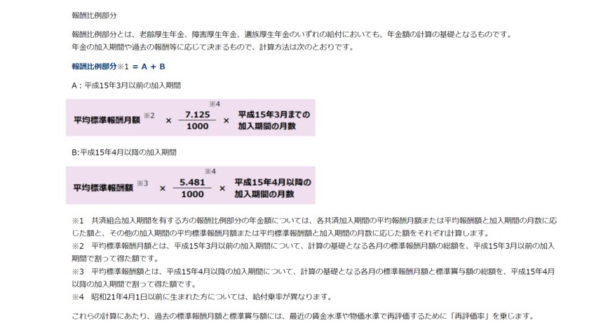 厚生年金受給額は加入していた時期により計算式が異なり、平成15年4月からの加入期間については、次の計算式を用います(従前額保障)。