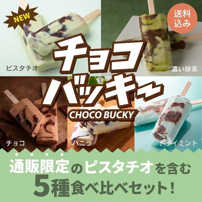 - セット内容:チョコバッキー ピスタチオ(6本入)×1袋、チョコバッキー バニラ(6本入)×2袋、チョコバッキー チョコ(6本入)×1袋、チョコバッキー ドライミント(6本入) ×1袋、大人のチョコバッキー 濃い抹茶(6本入)×1袋
