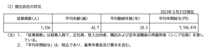 沖縄電力(提出会社)の2023年3月末時点での従業員数、平均年齢、平均勤続年数および平均年間給与は以下の通りです。