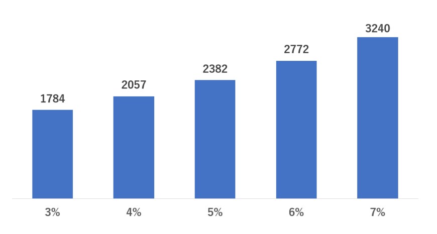 つづいて、年利の変化のインパクトをみてみましょう。たとえば40歳から投資を開始するとして、積立額を4万円としたときの、年利ごとの65歳時点の資産額は次の通りとなります。