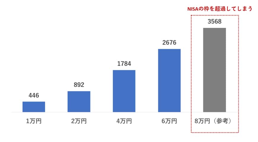 そうすると投資の一部はNISA以外で投資をする必要があり、その部分の利益には税金が発生します。このように月々の投資額を増やす場合には、NISAの限度額に注意しましょう。