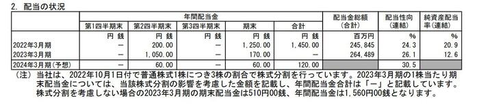 日本郵船の株式を1年前に買い、持ち続けたとすると、「2023年3月期の中間配当」と「2023年3月期の期末配当」の計2回を受け取ることができます。