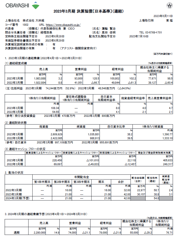 その結果、大林組の株価は2023年7月4日、前日比▲1.2%の下落となりました。