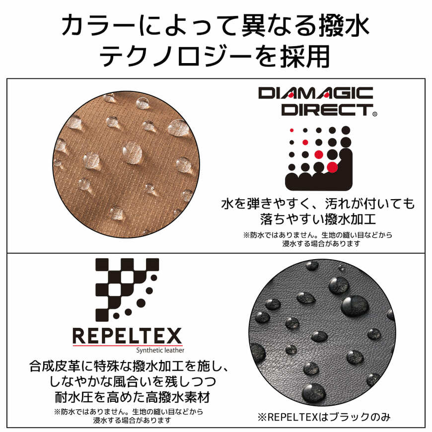 ブラックには10000mmの耐水圧性能を備えるREPELTEX(リペルテックス)を、ブラウン・カーキ・ベージュには高水準の耐久撥水性能を有するDIAMAGIC DIRECT(ディアマジックダイレクト)と、カラーによって採用している撥水テクノロジーが異なるため、天候やお出かけ先に合わせて使い分けるのもいいかもしれませんね。