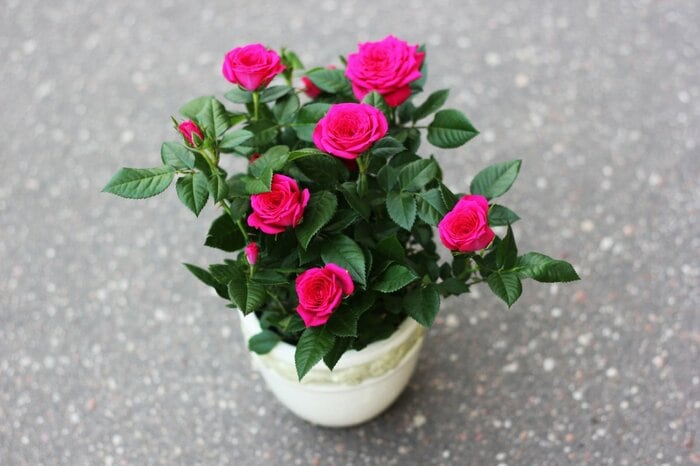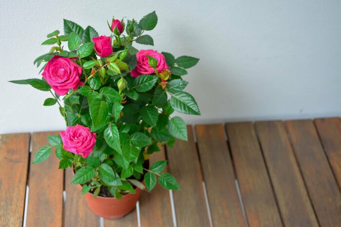 母の日や誕生日などにプレゼントされた鉢花のミニバラ。