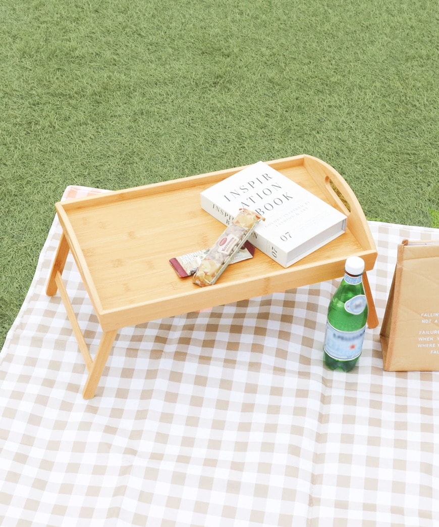 お弁当や飲み物はもちろんのこと、小物やお花などを置いてもかわいい、木目調の折りたたみテーブルです。脚を折りたたむことで、トレーとしても使える点もポイント。屋内で使うこともできます。