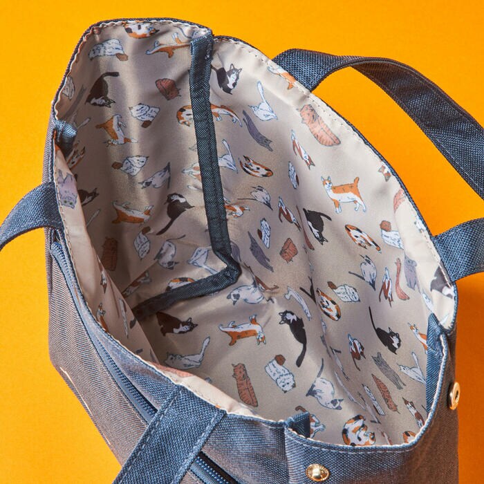 ちょっとしたおでかけやサブバッグにちょうど良い大きさのバッグです。サイドをスナップで止めれば荷物も飛び出しづらくなります。また、スマートフォンや鍵などを入れるのに便利なファスナー付きの外ポケットがあります。いろいろな種類のネコのイラストがキュートな裏地にも注目ですね。