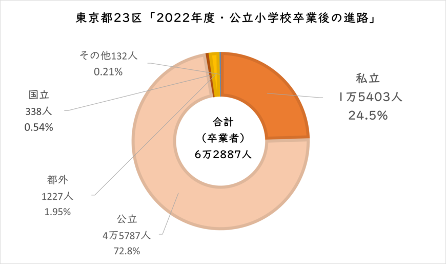 東京都教育委員会の「令和4年度公立学校統計調査報告書」によると、令和4年3月に都内23区の公立小を卒業した児童6万2887人のうち都内の中学への進学者は6万1528人でした。