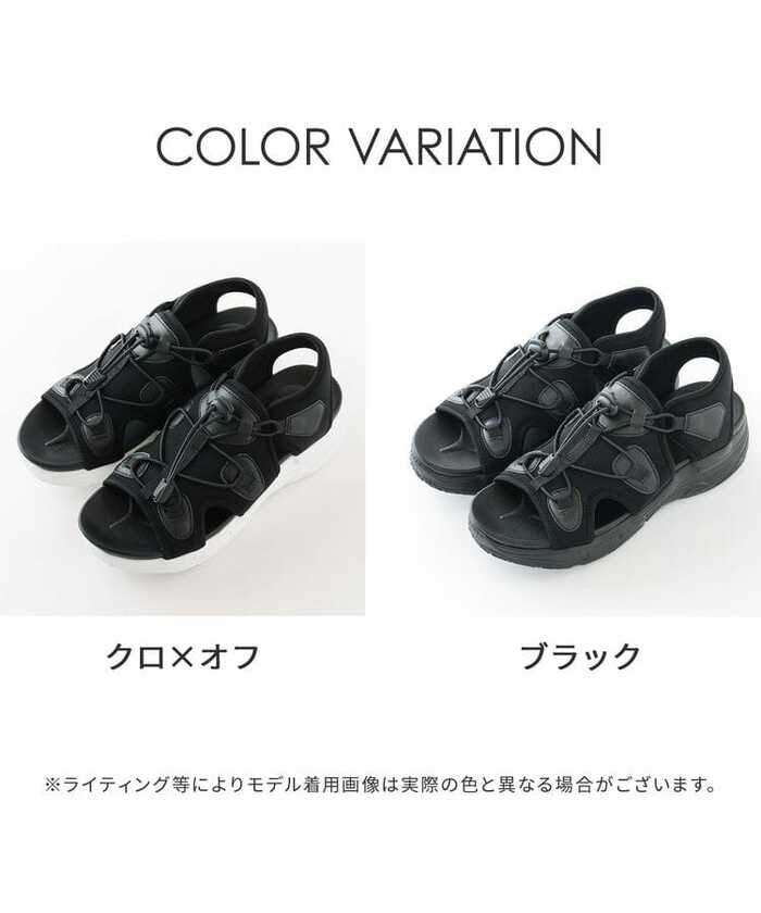 夏スタイルに欠かせないスポーティーなデザインが特徴のサンダルです。コード使いがトレンドライクなアクセントになっています。高低差の少ないプラットフォームのソールで、厚底でも歩きやすく安定感もバッチリ。伸縮性のある柔らかな素材に、フィット感を微調整できるコードが付いています。