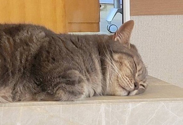 台の上にペタンと顔をつけてウットリと目を閉じるさぶろーくんは、テレビ画面の前を堂々と占拠。リモコン操作の妨げになってしまいそうなものの、あまりにも愛らしい寝顔にホッコリとした気持ちになります。