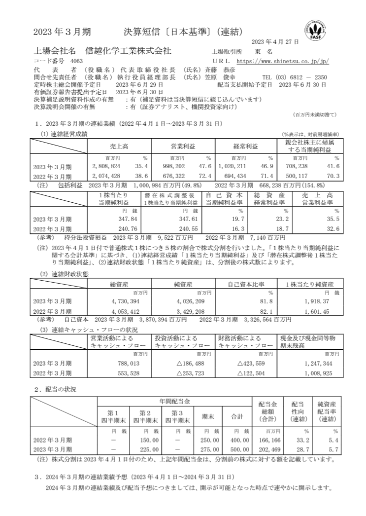 その結果、信越化学工業の株価は2023年7月6日、前日比▲2.7%の下落となりました。