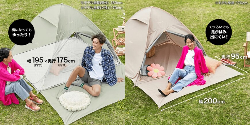 ポップアップテントというと手狭なイメージがありますが、LOWYA製は広々とした設計になっています。テント内は幅195×奥行175cmで、大人2人が横になれるスペースを確保しています。またフロントシートも幅200×奥行95cmと広く、複数人で使用するのにも適しています。テントを閉めてもフロントシートは独立して使えるなどの幅広いスタイルで使えるのもありがたいですね。
