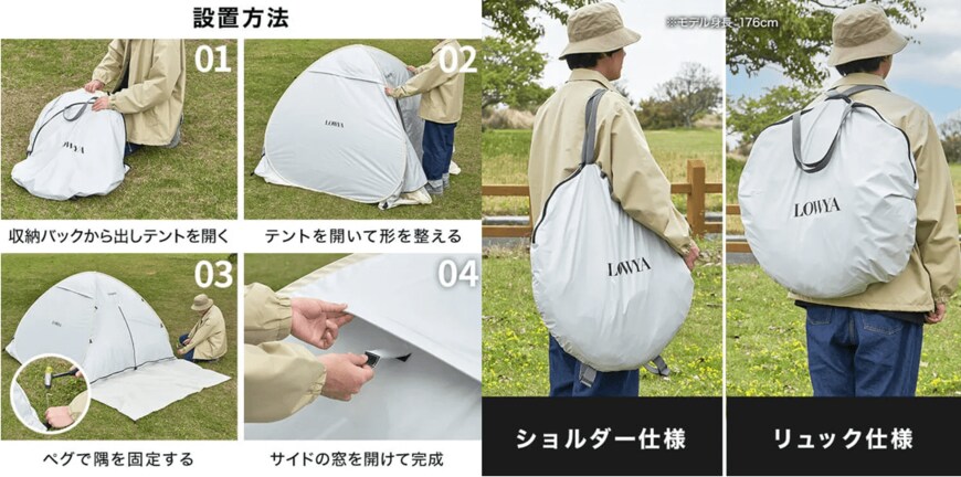 組み立てがシンプルなのも、うれしいポイント。収納バッグから取り出し、テントを開いて、形を整え、ペグで隅を固定すれば完成します。収納バッグは今年からサイズが大きくなり、収納しやすくなりました。またショルダーだけでなくリュックスタイルで持ち歩くことも可能です。