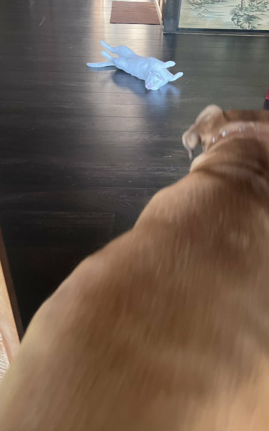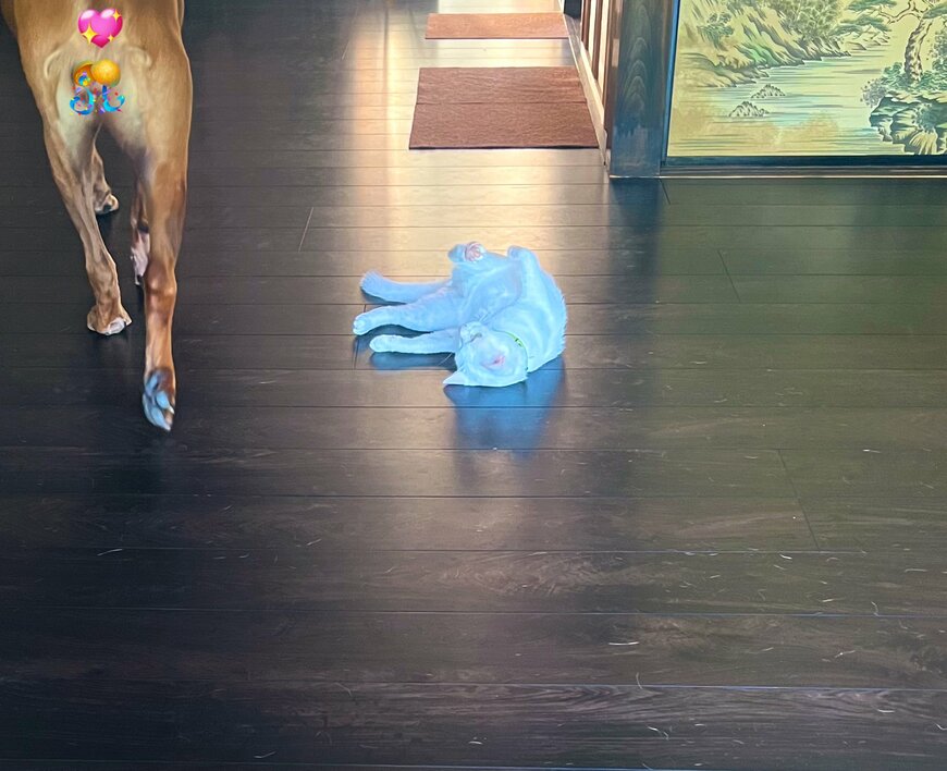 1枚目の写真には、散歩から戻ったワンちゃんの姿がありました。そのすぐ前には、床の上で大胆に仰向けになる猫ちゃんの姿も。「おかえり」のスタンバイをしているようですが……?