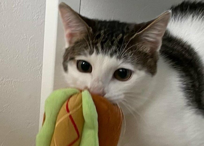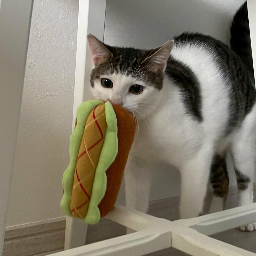 ホットドッグのおもちゃを一生懸命に運ぶ猫ちゃん。あまりにも愛らしい姿がTwitterで注目を集めています。