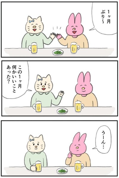 ウサギとネコは、1ヶ月ぶりに会う友だち同士。「何か良いことあった?」と近況を語り合っています。「うーん」と最近あったことを思い出そうとするウサギでしたが…。