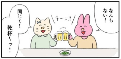 「なんもない!」と思いつくことは無かったようです。するとネコも「同じく!」と笑い、ビールの入ったジョッキで力強く乾杯したのでした。良いことがないと感じる日常でも、こんな友だちがいてくれれば心強いですよね。