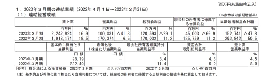また、2023年度(2024年3月期)は売上高は2023年3月期と同程度ながら、営業利益率10%、営業利益2200億円への増益を見込んでいます。