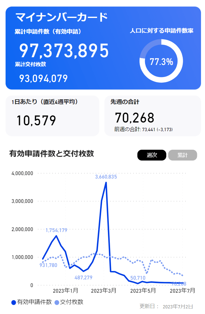 デジタル庁が2023年7月7日に発表した政策ダッシュボード(ベータ版)によると、7月2日時点のマイナンバーカードの累計申請件数(有効申請)は9737万3895件、累計交付数は9309万4079件。人口に対する申請件数率は77.3%。1日あたりの申請件数は1万579件(直近4週平均)。先週の申請合計件数は7万268件で、前週から3173件減でした。