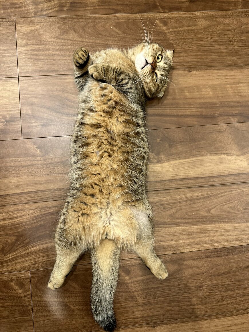 そこに写っているのは、フローリングの上にゴロン!と仰向けになる「たぬ吉」くんの姿です。床掃除をする飼い主さんをよそに、堂々たる開脚で広々とくつろいでいます。