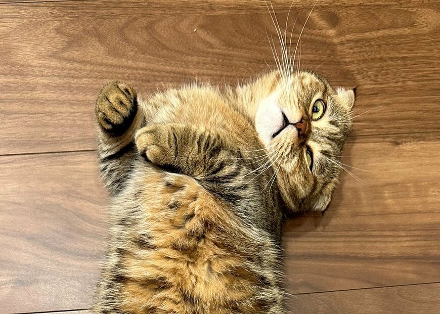 全開にしたお腹のモフモフ感や、ちょこんと添えたおててが視線を惹きます。
