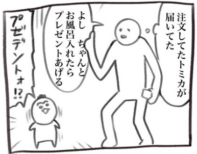 「@inu_eat_inu」さんのもとに注文していたトミ力が届いたようです。2歳になる息子ちょーちゃんに「ちゃんとお風呂に入れたらプレゼントあげる」と伝えると、ちょーちゃんはうれしさと驚きでテンションMAX。いつもは嫌がるお風呂も、この日は様子がつがいます…。