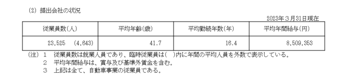 日産自動車(提出会社)の2023年3月31日現在での従業員数、平均年齢、平均勤続年数および平均年間給与は以下の通りです。