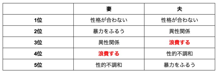 裁判所の司法統計の発表した調査データでは、夫婦の離婚の原因として、妻・夫共に「浪費する」ことが上位にあがっています(【図表1】参照)。