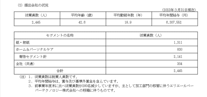 大王製紙(提出会社)の2023年3月31日現在での従業員数、平均年齢、平均勤続年数および平均年間給与は以下の通りです。