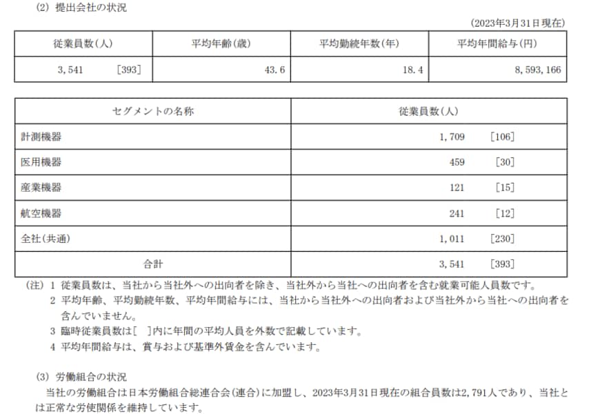 島津製作所(提出会社)の2023年3月31日現在での従業員数、平均年齢、平均勤続年数および平均年間給与は以下の通りです。