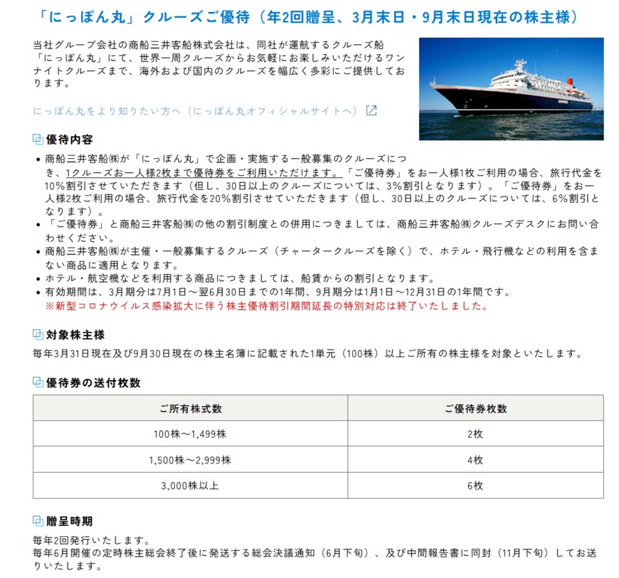 商船三井は決算期(2023年3月期)現在、100株以上保有する方に向けて「にっぽん丸」クルーズ優待を3月9月の年2回2枚ずつ、フェリーサービス「さんふらわあ」優待を9月の年1回1枚提供しています。