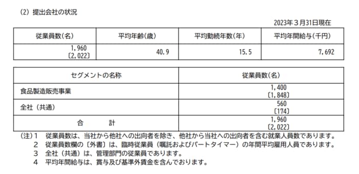 カルビー(提出会社)の2023年3月31日現在での従業員数、平均年齢、平均勤続年数および平均年間給与は以下の通りです。