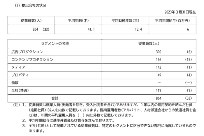 東北新社(提出会社)の2023年3月31日現在での従業員数、平均年齢、平均勤続年数および平均年間給与は以下の通りです。