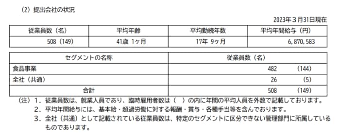 エバラ食品工業(提出会社)の2023年3月31日現在での従業員数、平均年齢、平均勤続年数および平均年間給与は以下の通りです。