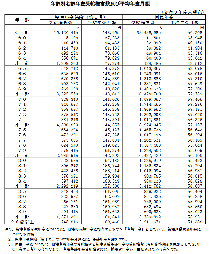 厚生労働省年金局「令和3年度 厚生年金保険・国民年金事業の概況」から抽出した年齢ごとの金額は以下のとおりです。