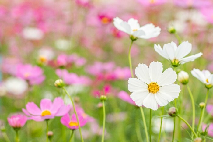 秋らしさ満載のコスモスは、ピンクやホワイト、イエローの花が可愛らしい一年草です。コスモスの種まき適期は4月~9月。