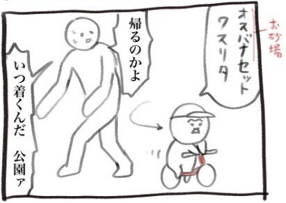 なんとちょーちゃん、「お砂場セット忘れた」とつぶやき、家まで引き返そうとします。大人なら忘れても気にしなさそうなアイテムですが、子どもにとっては大切なもの。自由気ままな子どもの行動に振り回され、親は「いつ公園にたどり着くの!?」と感じてしまいますが、子どもの目線に立って気長に付き合ってあげたいですね。