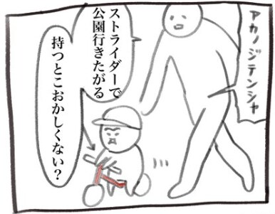この日「@inu_eat_inu」さんと、2歳になる息子ちょーちゃんは公園に向かっていました。ちょーちゃんは自分のストライダーに乗りたがるも、手を置くところがなんだか不安定。パパはヒヤヒヤしながら見守ります。そして公園まであと少しと言うところで、ちょーちゃんの様子がなにやら変わってきたのです…。