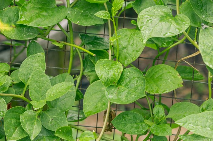 ツルムラサキは茹でるとぬめりが出るのが特徴。歯ごたえがありヌルヌルとした食感がワカメににているので、「オカワカメ」という別名も。