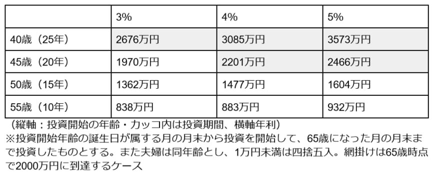 【図表2】をみてわかる通り、老後に必要といわれる2000万円を65歳までに用意する場合、40歳から投資を始めれば、上記いずれの年利でも達成が可能です。