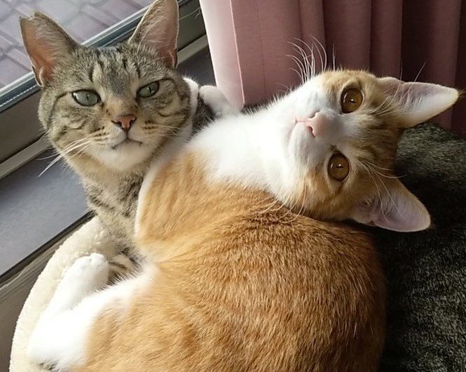 SNSで反響を呼んでいる、お兄ちゃんの上で嬉しそうにくつろぐ妹猫ちゃんと、クールな視線を送る兄猫ちゃんの、可愛さあふれる光景をご紹介しました。