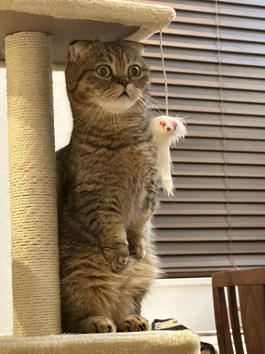 キャットタワーの中段で直立する猫ちゃん。見事なおさまり具合がほほえましいとTwitterで注目を集めています。