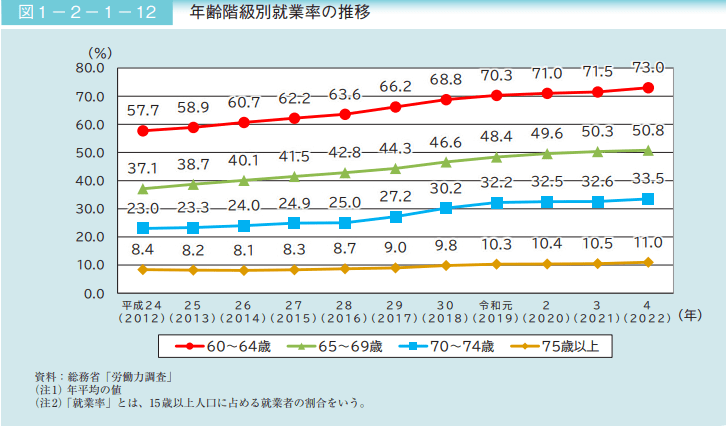 内閣府が2023年6月20日に発表した「令和5年版 高齢社会白書」によると、60歳代の就業率は「60~64歳」で73%「65~69歳」で50.8%となっています。