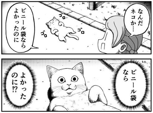 しかし、そこにいたのはビニール袋ではなく猫。女性は「ビニール袋ならよかったのに…」と落胆します。猫も自分よりビニール袋がよかったと聞いて、屈辱のあまり驚愕の表情を浮かべたのでした。猫の手も借りたいとはよく言いますが、「猫よりビニール袋」は想像の斜め上過ぎて思わず笑ってしまいますね。