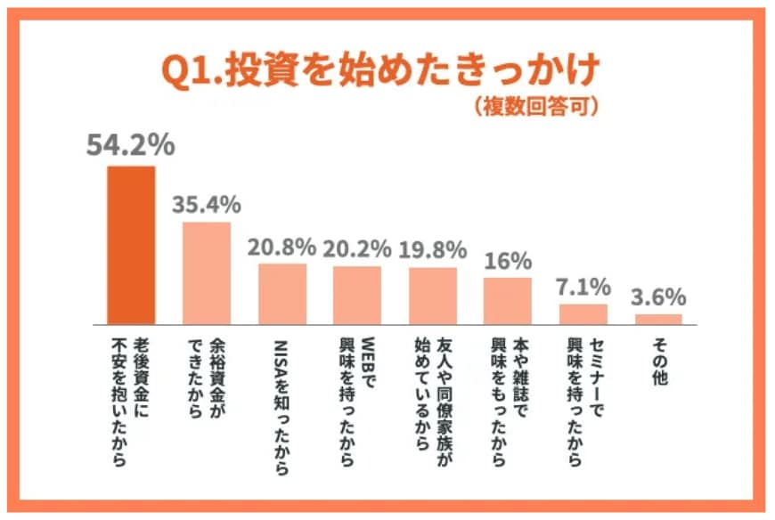 上記調査の結果、投資を始めたきっかけとして54.2%の人が「老後資金に不安を抱いたから」と回答しています。