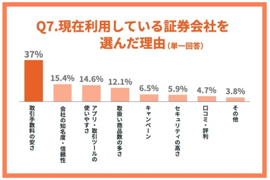 株式会社ZUUの調査では、現在利用している証券会社を選んだ理由として、「取引手数料の安さ」と回答した人が最も多い結果となりました。