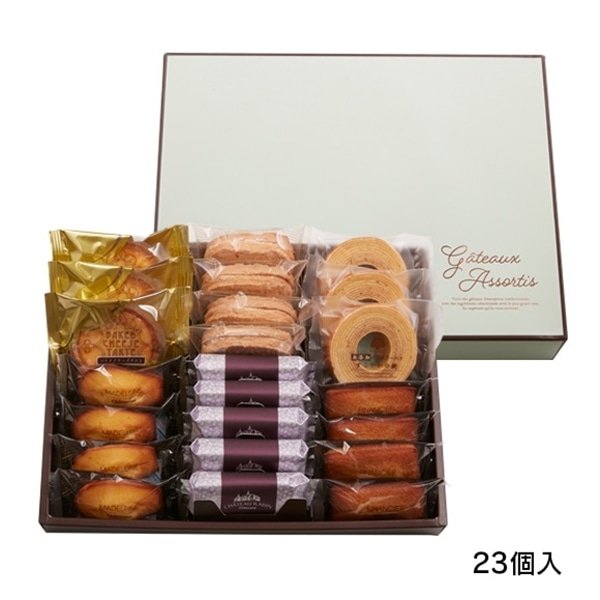 - 詰め合わせ内容:23個入(ベイクドチーズタルト×3個、無添加バウムクーヘン×3個、フィナンシェ×4個、マドレーヌ4個、ダックワーズコーヒー×4個、シャトー・レザン ×5個)