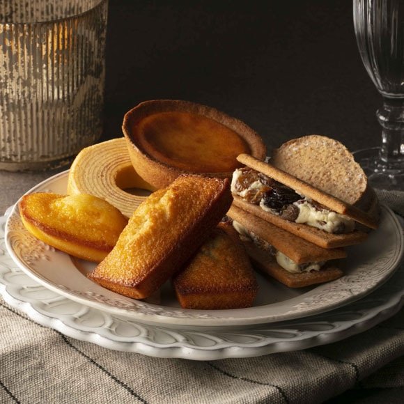 クリームチーズを使用した「ベイクドチーズタルト」、風味豊かで無添加の「バウムクーヘン」、バターのうまみがじっくりと味わえる「マドレーヌ」、しっとりとした食感の「フィナンシェ」、サックリとした食感の「ダックワーズコーヒー」、芳醇な香り広がる自家製レーズンをクリームにたっぷりと混ぜ込みクッキーにサンドした「シャトー・レザン」が入った焼き菓子の詰合せセットです。(店舗により詰合せ内容が異なる場合があります)